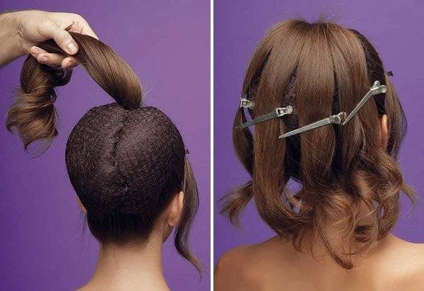 Для выполнения этой интересной и роскошной укладки необходимо поделить все волосы при помощи горизонтального пробора, который проходит вверху головы. Нижнюю часть отделить и закрепить крабиками. А вот верхние волосы завить, используя крупную плойку. Полученные локоны не стоит распускать, а заколоть их зажимами, чтобы они полностью остыли. Затем можно обработать их лаком.