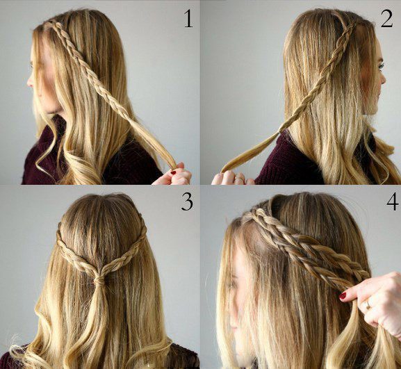 Эта прическа подходит только тем девушкам, у которых от природы густые и длинные волос. Необходимо расчесать их, обработать муссом или пенкой. В области виска отделить 3 прядки и приступить к созданию традиционный косы, не наружу, а вовнутрь. В ходе плетения захватывать новые прядки. При этом подхват выполняется исключительно с правой стороны. Таким образом, удается создать ажурный эффект.