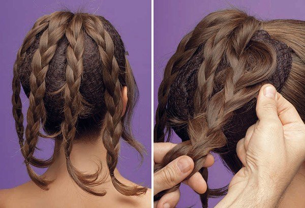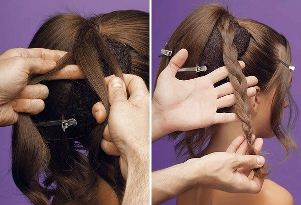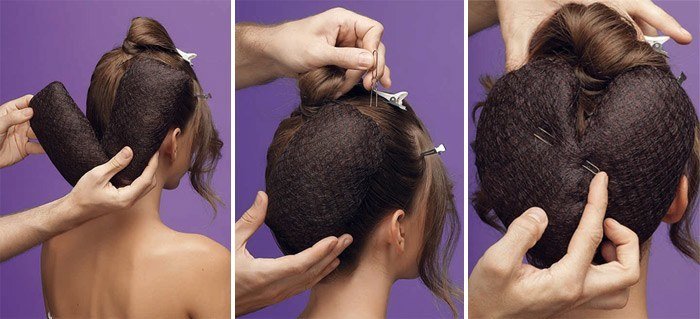 - Сверху уложите валик и закрепите его так, как показано на фото. Разделите концы пополам и прикрепите невидимками к голове.