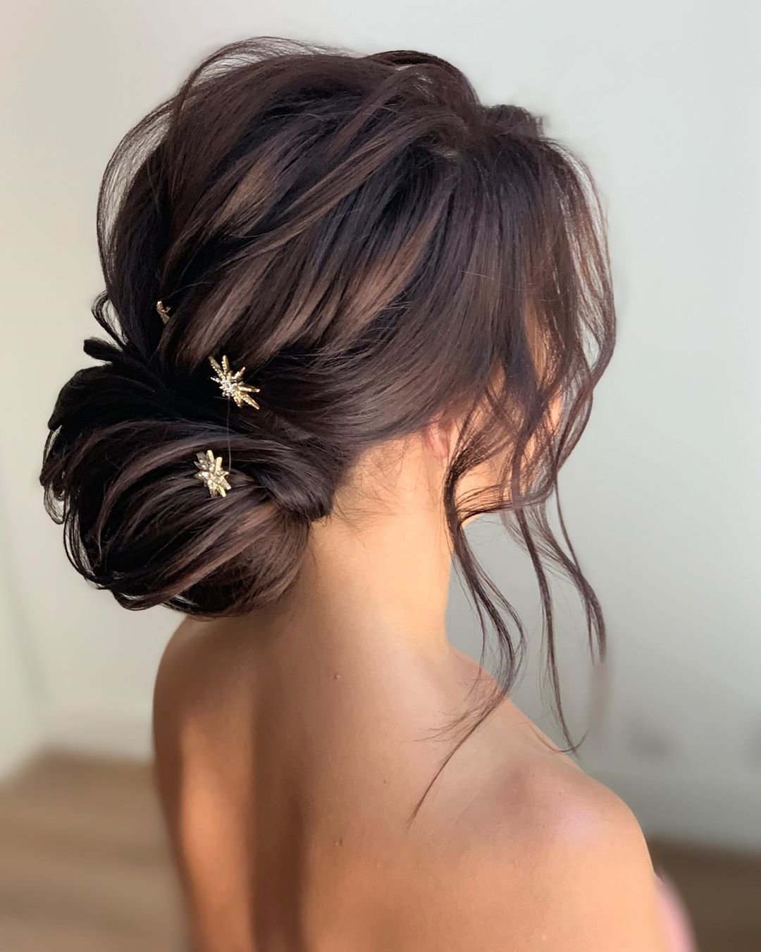 Длинные волосы можно смело собирать в низкий или высокий пучок. Это зависит от длины, густоты волос и ваших личных предпочтений. Хорошо смотрятся оба варианта, к тому же всегда можно добавить прическе оригинальности. Это несколько выпущенных прядей, эффект небрежности, плетение вокруг пучка или интересная заколка.