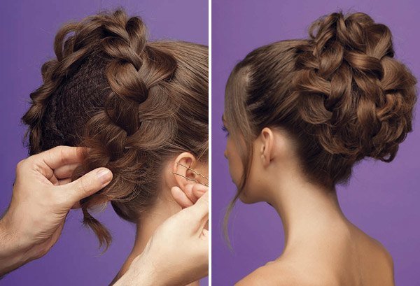 - Отделенные по бокам две тонкие прядки скрутить в жгут и выложить под сферой восьмеркой, скрепить крестом невидимками.