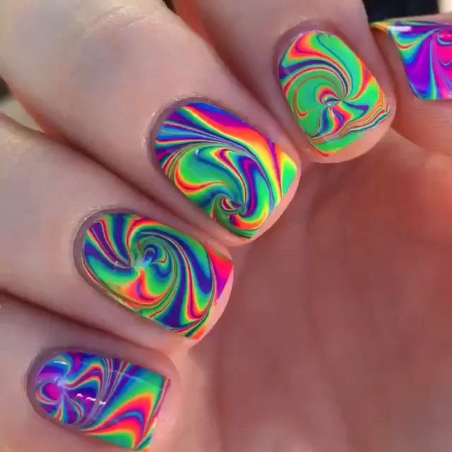 Эта оригинальная технология позволяет смешивать абсолютно любые оттенки, потому как создает эффектные переходы на ногтях. Чтобы исполнить интересный дизайн, следует подготовить миску с водой, шпажку, абрикосовую палочку и лаки нужных оттенков. Когда все необходимое готово, опускаем на водную гладь несколько капель так, чтобы одна находила на другую. После берем шпажку и растягиваем ею оттенки, создавая произвольный узор. Добившись нужного результата, опускаем палец в миску ногтем вниз. Держим пару секунд и вынимаем. Лишний лак аккуратно убираем абрикосовой палочкой. При необходимости яркий маникюр с разными цветами фиксируем прозрачным лаком или топом.