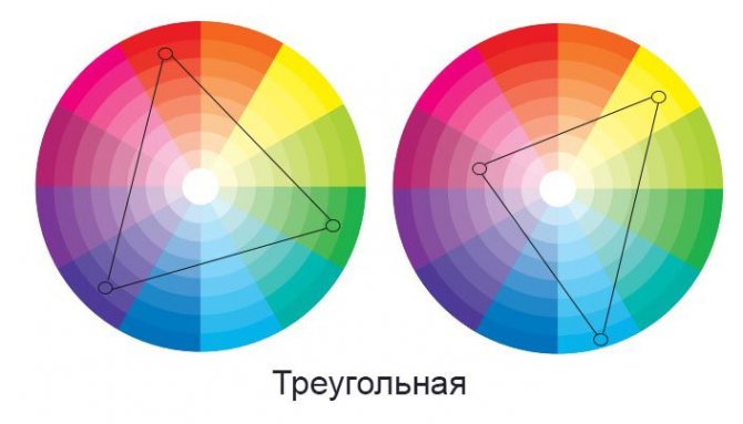 Еще один беспроигрышный вариант – выбрать на цветовом круге три равноудаленных оттенка. Такой маникюр будет выглядеть очень ярко и выразительно. Такое сочетание оттенков называется триадной. Выберите основной оттенок, который вы хотели бы видеть в своем маникюре, и подберите для него два других цвета, расположенных на одном круге с основным. Пример триадной схемы вы можете видеть на фото ниже.