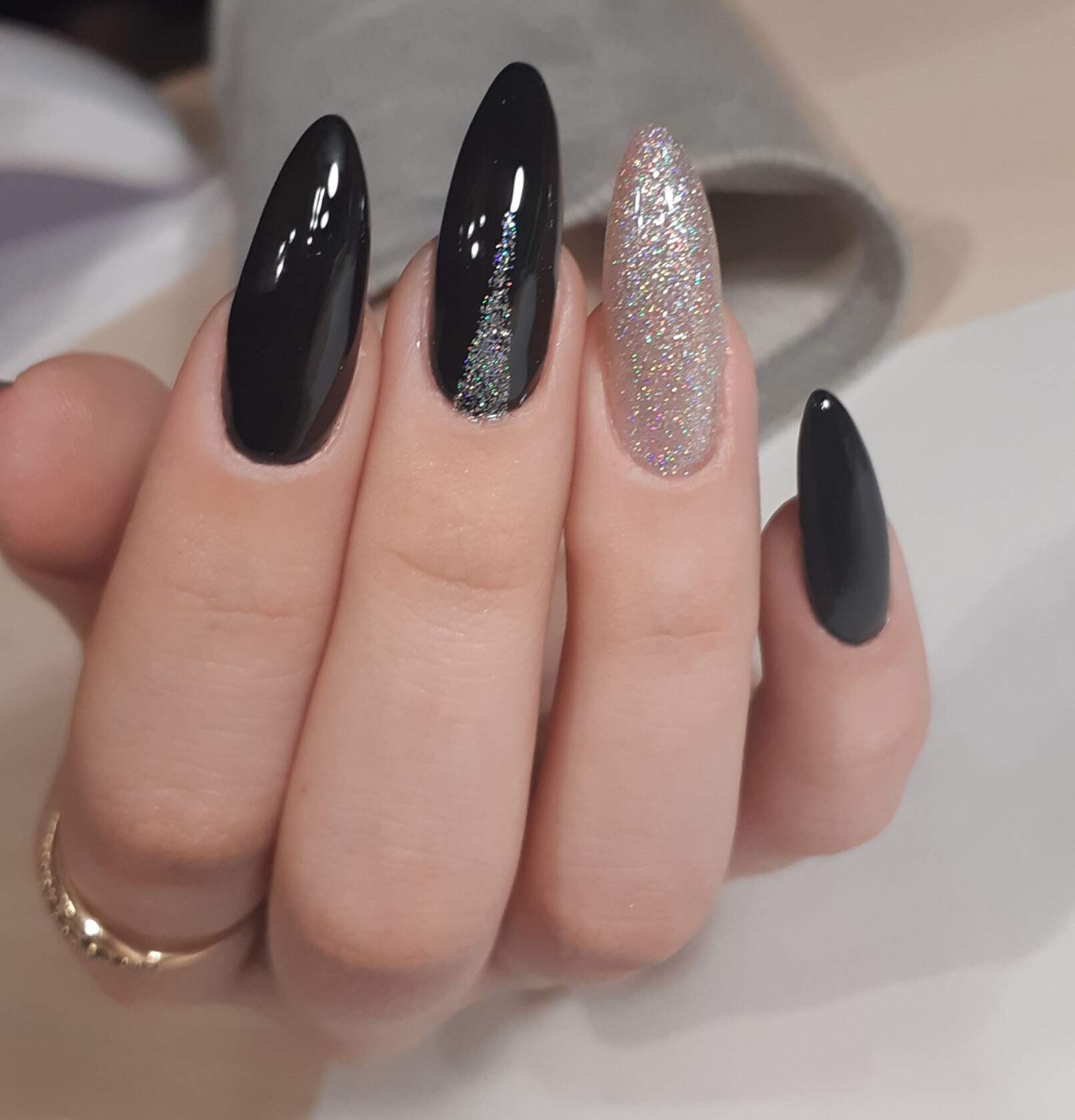 Красивы сочетания черного глянцевого лака и лаков других цветов с блестками. Можно накрасить ногти двумя цветами по типу лунного маникюра, лунного маникюра, когда другим цветом выделяются «солнышки» у основания. Интересен также геометрический маникюр — два цвета разбивают ноготь по вертикали, диагонали или же горизонтально.