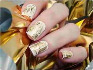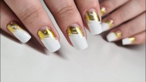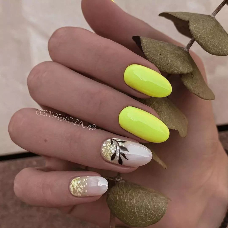 Этот стиль набирает все большую востребованность и популярность, становится распространенным и все чаще делается не только с желтыми, но и с иными цветами. Фольга должна использоваться умеренно, чтобы основной цвет не потерялся в дизайне.