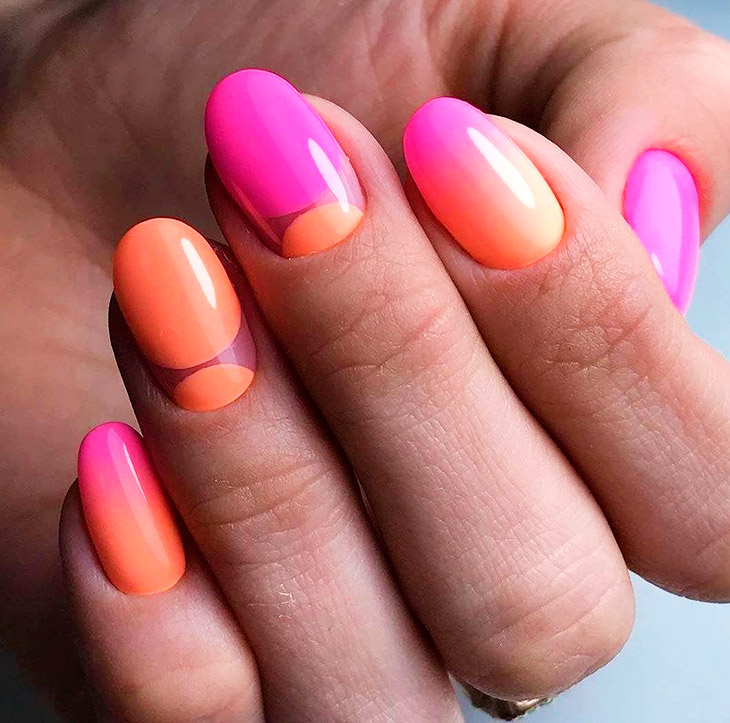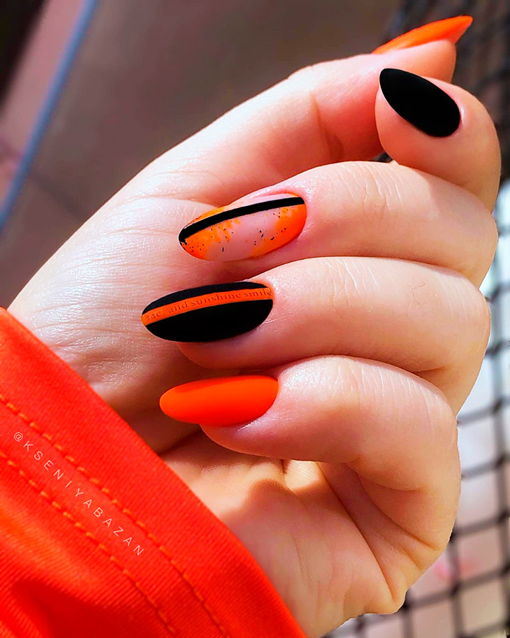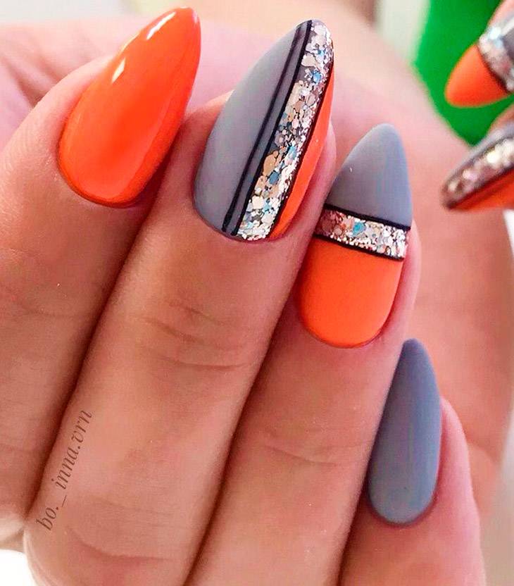 В зависимости от возраста, не на каждую длину подойдет оранжевый. Стоит понимать, что форма тоже диктует условия и может загонять в рамки выбора декора. Модными идеями на короткие ногти в этом сезоне будет геометрия, абстракция, а на длинные – френч и темотичные рисунки.