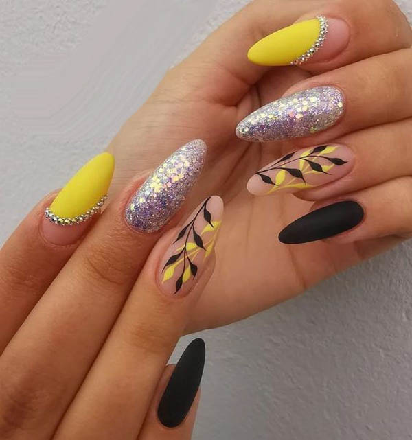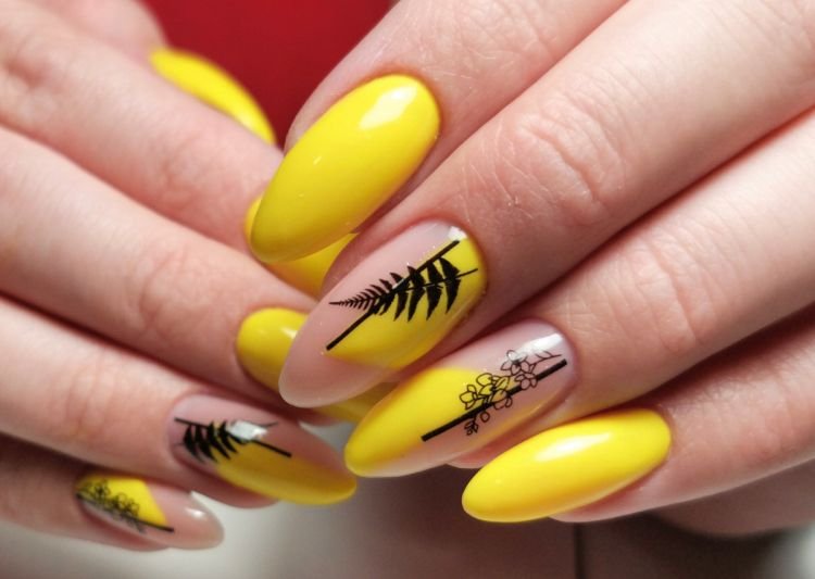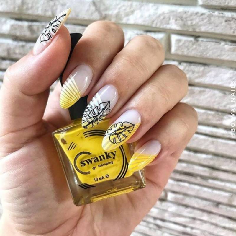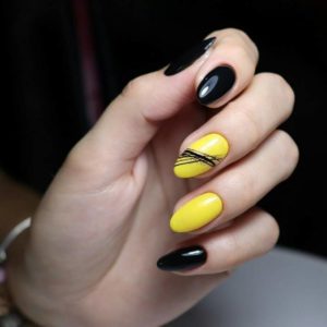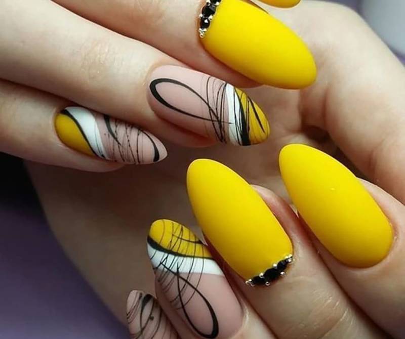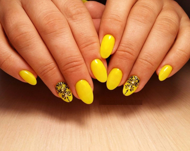 На ногтях любой формы, длины привлекательно смотрятся абстрактные завитки вместе с узорами. В маникюр удачно будут вписываться красочные оттенки жёлтого.