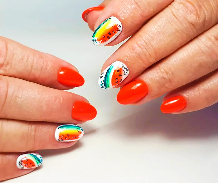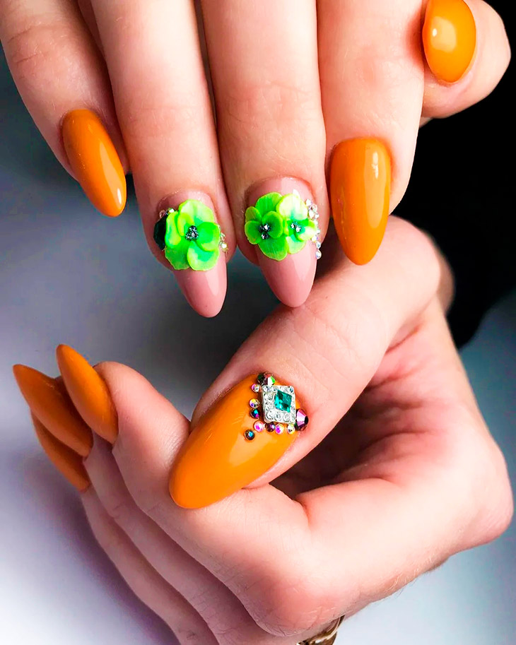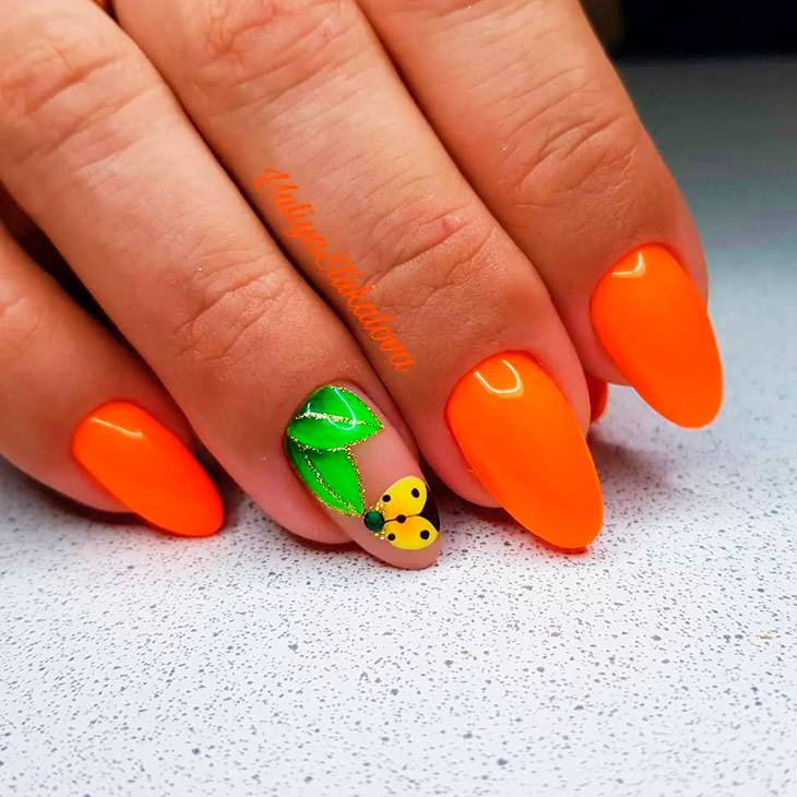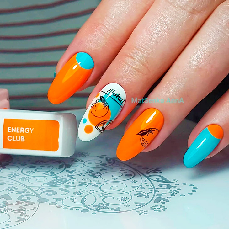 Мятный в оранжевом маникюре наполнен свежестью. Сочетание летнее и непринужденное. Создается атмосфера праздника и смелого выражения эмоций.