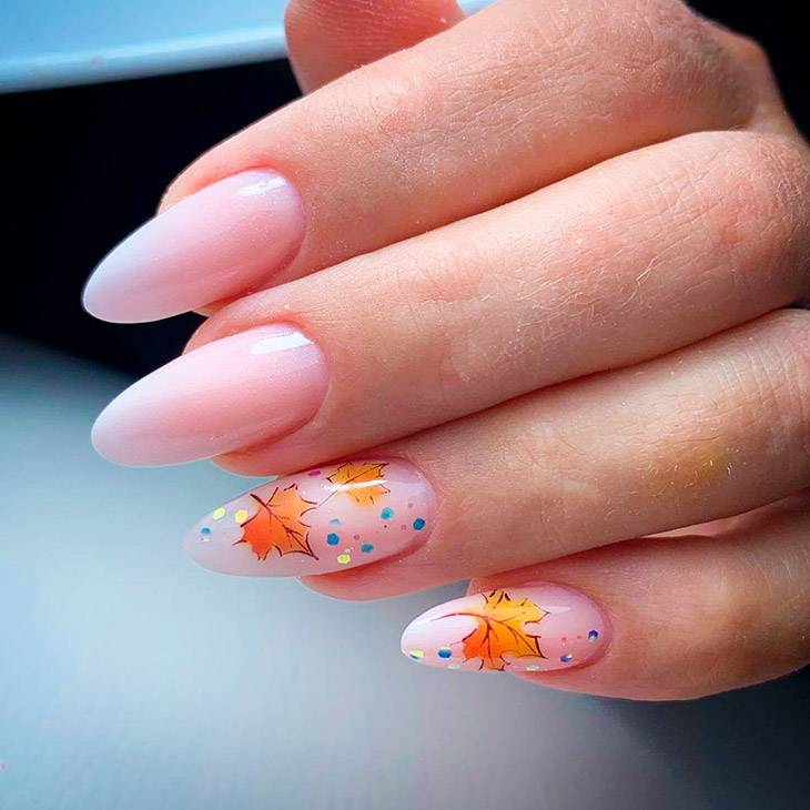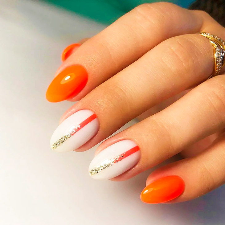 Непринужденный молочный будет являться отличным фоном для сочного оранжевого. Элегантный и изысканный маникюр, который легко подойдет под любой стиль одежды.