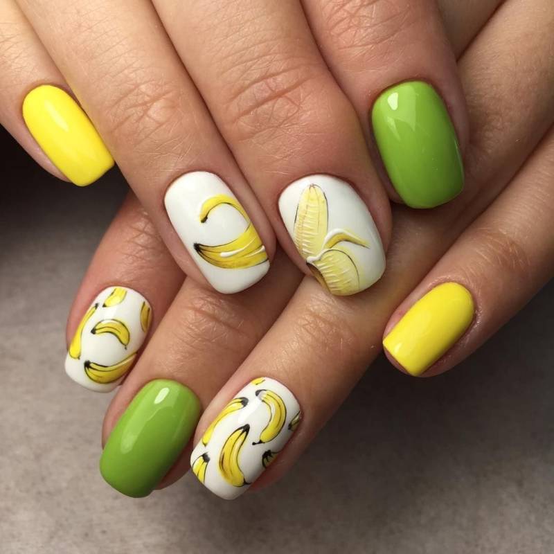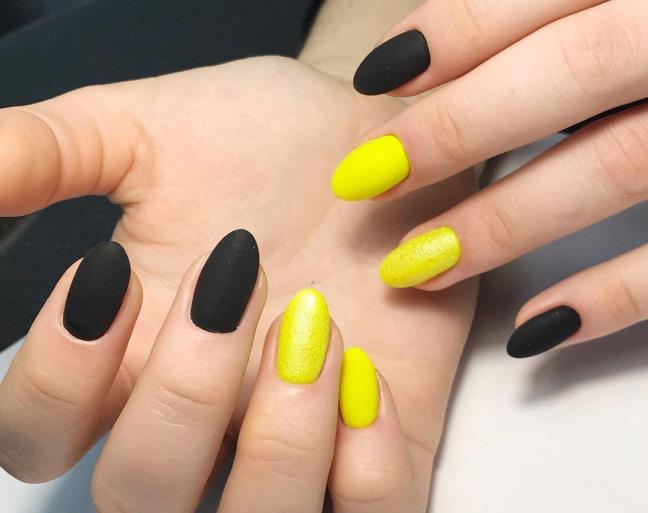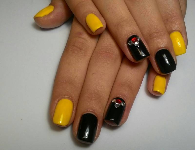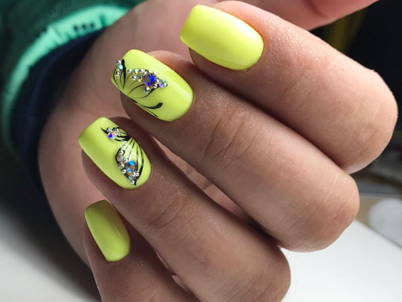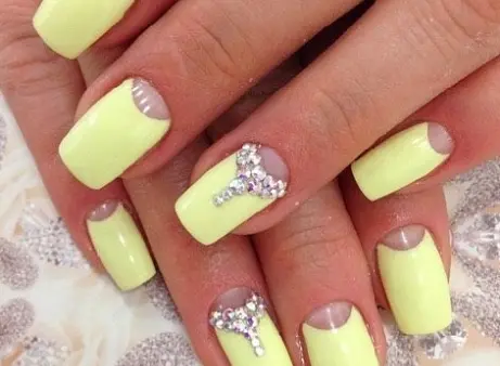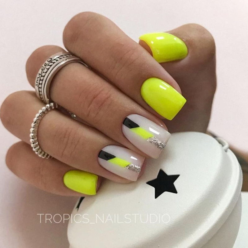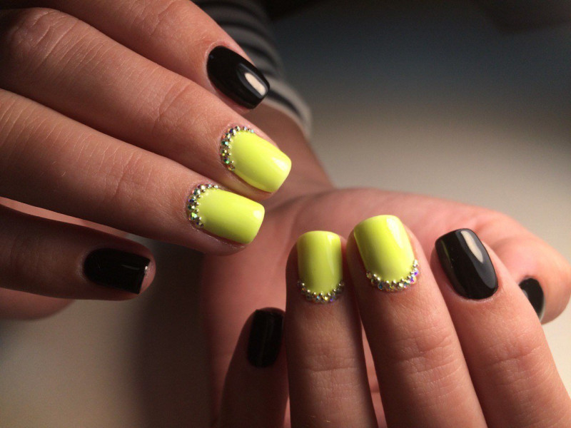 Смелые особы могут использовать желто-зеленые оттенки. Данный маникюр выглядит неординарно, и в некоторой степени даже эпатажно, поэтому и подходит не всем. Но, это не мешает модницам покупать такие расцветки с огромным удовольствием. Стоит отметить, что желто-зеленая эмаль потрясающе выглядят на бледной коже. А если хочется быть действительно в тренде, следует сделать желтый матовый маникюр. А тем, кто предпочитает более размеренный стиль, может примерить на себя светлые оттенки мякоти банана, ванили, дыни, топленых сливок. Далеко не все согласятся на маникюр с использованием таких тонов. Но в этот лак можно добавить немного блеска, достаточно влить в бутылек цветной глиттер. Кроме этого дизайнкеры советуют украсить маникюр стразами. Вполне достаточно будет посадить их на несколько ногтей. А если хочется маникюр, как у звезды, то следует приготовиться к тому, чтобы сделать что-то необычное. Так, например, можно покрасить четыре ногтя на руке в черный (синий, индиго, вишневый) цвет, а последний в ярко-желтый
