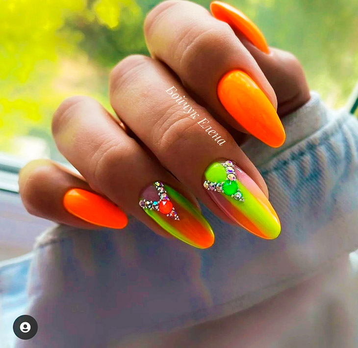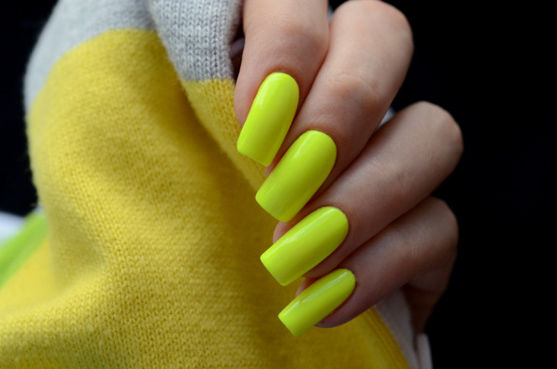 - маникюр в неоновых тонах бросается в глаза, поэтому покрытие должно быть идеальным. Ногти требуют тщательной подготовки и полировки, на ногтях не должно быть затеков и не прокрашенных зон.