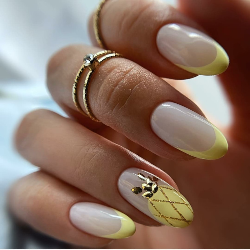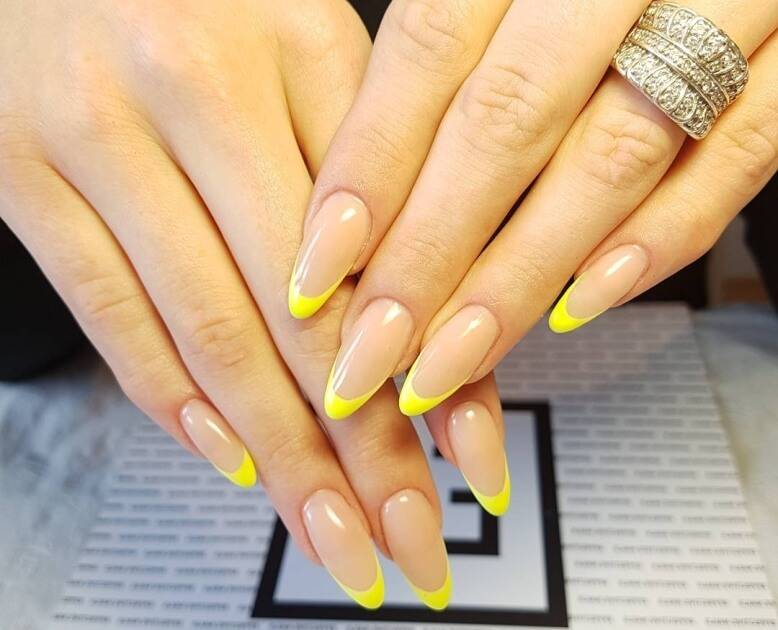 Френч – это классика, которая никогда не выйдет из моды. Такой дизайн всегда выглядит уместно и аккуратно, в любом стиле и образе, а потому его стоит рассматривать. При использовании цветного лака желтого оттенка можно будет произвести покрытие всей ногтевой пластины, после чего контрастным цветом нарисовать френч. Или же можно будет сразу произвести рисование дизайна при использовании оттенка желтого.