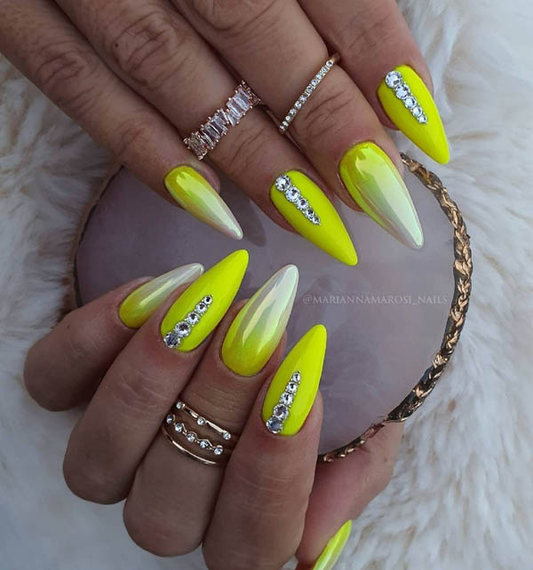 Чем более холодным будет выбранный оттенок желтого, тем будет он будет сочетаться с серебряными стразами и блестками разного размера.