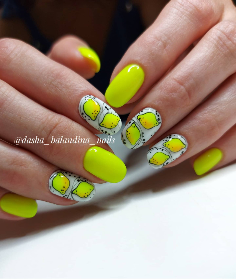 - Техника «negative space» отлично дополняет цвет лимона, делая маникюр более сдержанным, строго-элегантным.