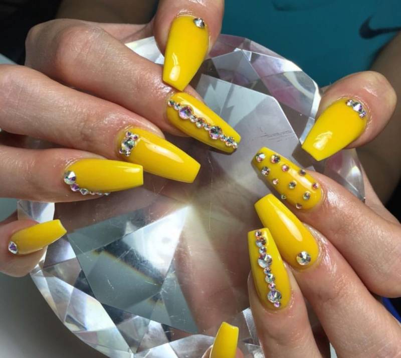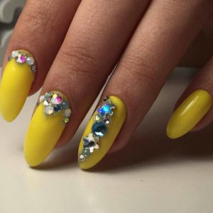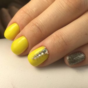 Желтый цвет – один из оптимальных вариантом для создания дизайнов при использовании блесток и страз. Одинаково привлекательно смотреться дизайны как с золотыми отливами, так и с серебряными.