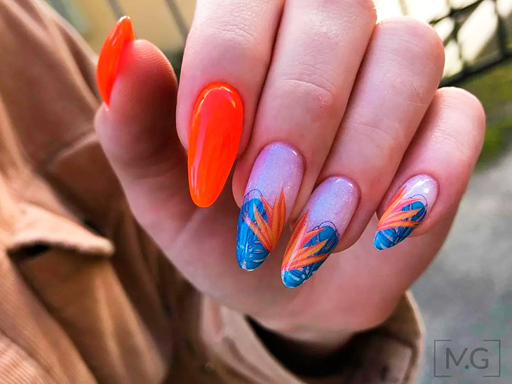 Тропические варианты оформления. Листья и пальмы, экзотические птицы и подобные предложения будут отлично смотреться в летнем оформлении маникюра