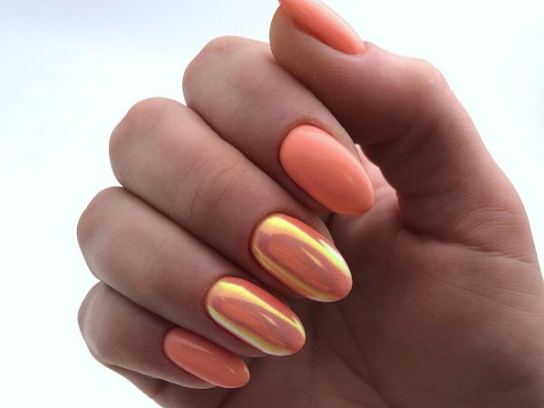 На короткие ногти нужно подбирать более сдержанный оранжевый, так как броские акценты зачастую смотрятся как пятна, и визуально укорачивают пальцы.