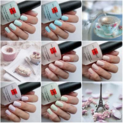 Лаки пастельных тонов: мятно-бирюзового, небесного, ванильного, лилового. При нанесении создают идеальное матовое покрытие.