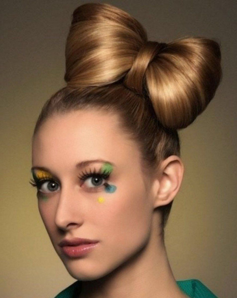 Очаровательный бант тоже можно без особых проблем создать самостоятельно, без посещения салона красоты. Потребуются резинка и невидимки. На макушке формируют хвост, не вынимая волосы до конца. Получившуюся петлю делят на две части и закрепляют в виде банка невидимками.