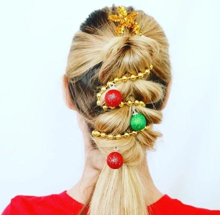 По двум сторонам головы создают два хвостика и скручивают тугими жгутами. После формируют из них дульки и украшают аксессуарами. Это – прекрасная идея для игривого новогоднего образа для молодой девушки.
