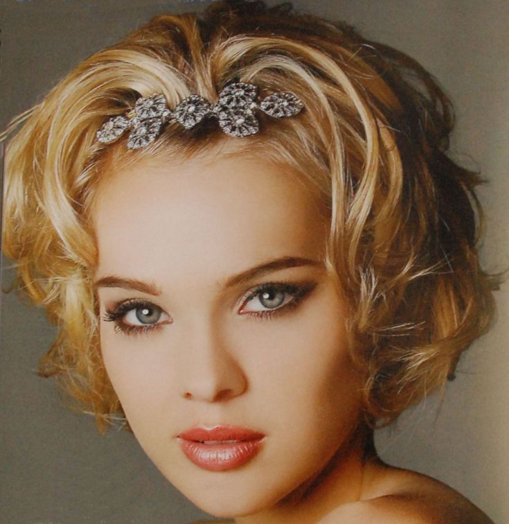 Локоны завивают на крупные бигуди или при помощи плойки, надевают ободок и осторожно заправляют в него волосы на затылке