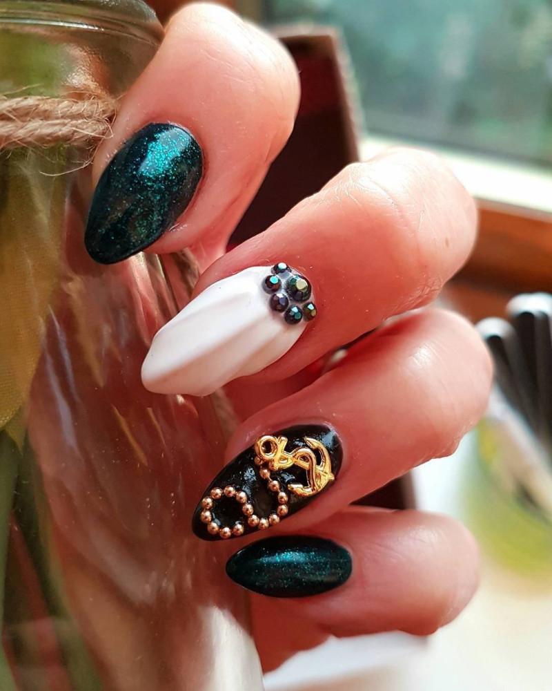 Насыщенный цвет не терпящий излишек. Самая актуальная классическая комбинация – это чёрно-зелёный или золото. В оформление маникюра лучше остановиться на френче, кошачьем глазе или небольшом количестве страз.