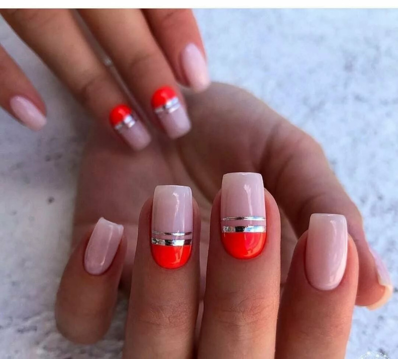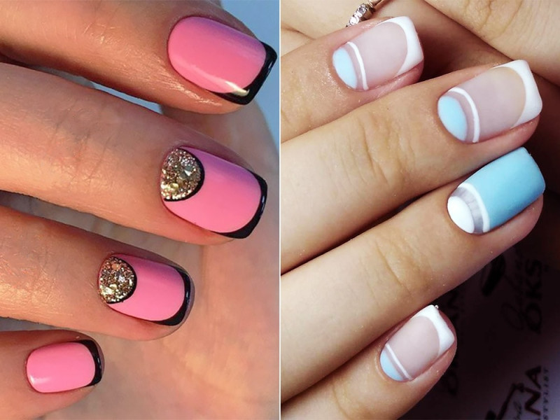 Можно отойти от классических тенденций и сделать лунный маникюр, добавив цветовые штрихи либо контрастные полоски, а также оформить ноготки в стиле negative space.