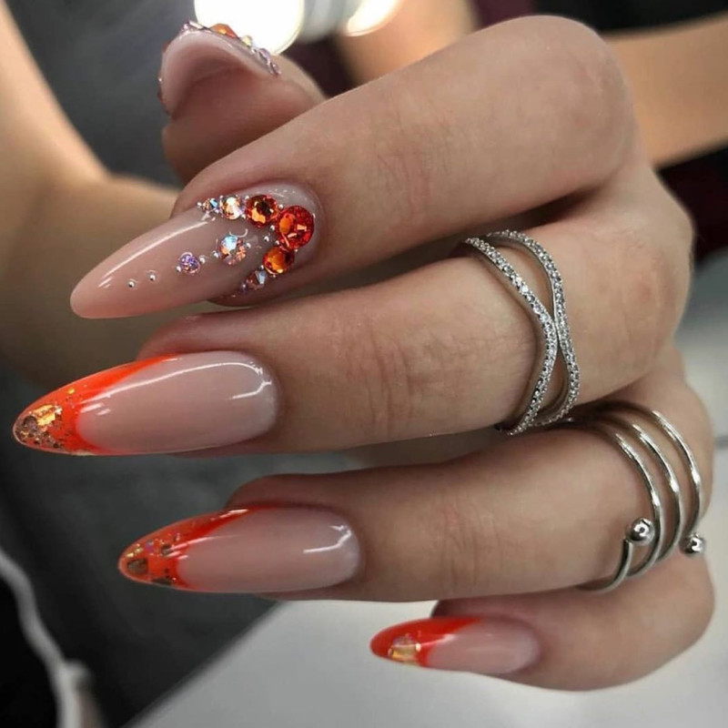 Актуально сочетание ярких оттенков и миндалевидной формы. Могут применяться различные варианты декора: стразы, песок, градиент, сочетание глянцевого и матового покрытия.