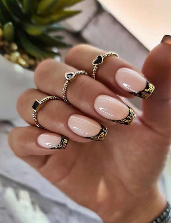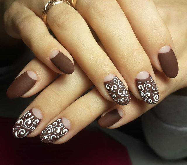 Этот необычный дизайн был протестирован модницами не так давно, но сейчас набирает обороты популярности. Тёплая цветовая гамма идеально вписывается в концепцию сезонного образа! А лучшее дополнение для такого красивого маникюра – тонкая линия золотого глиттера, обрамляющая ногти.