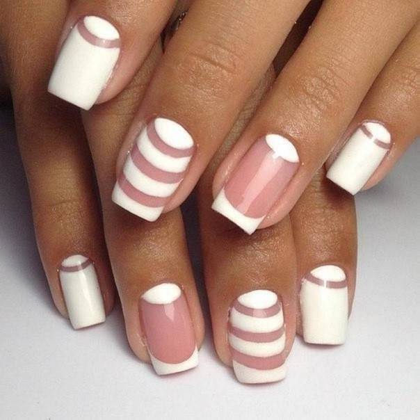 - Френч с белыми либо цветными полосками. Он универсален, визуально удлиняет ноготки, делает их аккуратными и нежными.