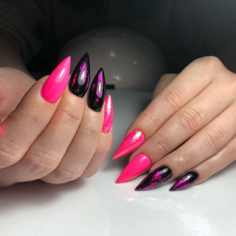 Взгляните на фото модного дизайна 2020 для нарощенных ногтей в экстравагантной форме стилета.