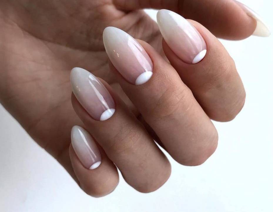 Взгляните на фото красивых нарощенных ногтей в тенденциях 2020 года – миндалевидная форма часто подчёркивается контрастным френчем, но есть и однотонные дизайны.