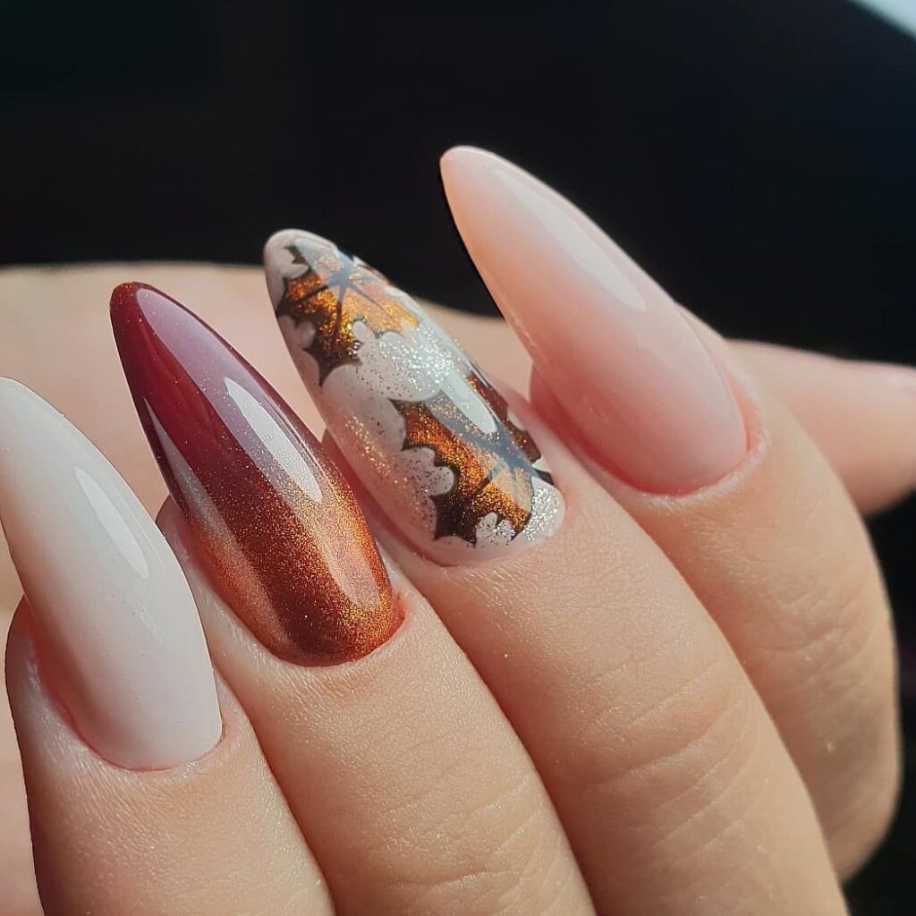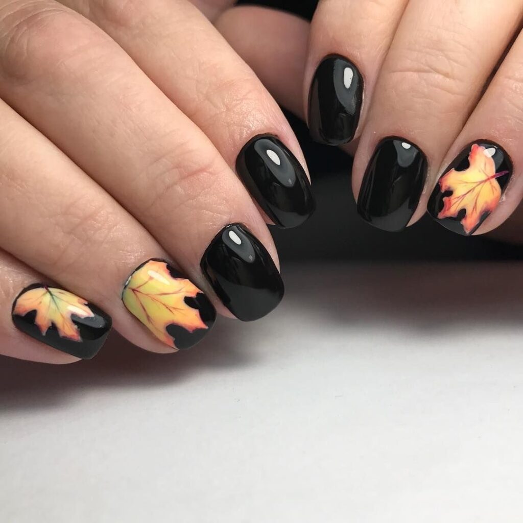 Осенняя пора ассоциируется с желтыми листьями, уютным пледом, чашечкой ароматного кофе и серыми тучами. Мастера успешно воплощают эти символы в своем искусстве. На Хеллоуин можно стилизовать маникюр под тыкву, мухоморы, летучих мышей , паучков, осенние листья. Посмотрите на фото, как красиво смотрятся на ногтях осенние мотивы.