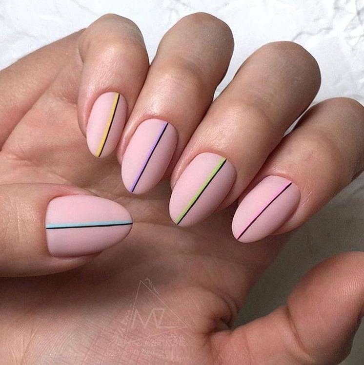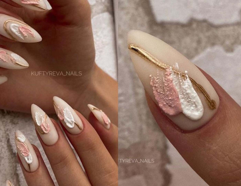 Модный и необычный штрих можно добавить маникюру с помощью небольших мазков из специальной пасты для дизайнов ногтей или смешав гель-краску с акриловой пудрой. Такие штрихи делают на готовом ногте поверх финишного покрытия в матовом и глянцевом варианте. Это прекрасная возможность добавить к однотонному маникюру некой изюминки и оригинальности.