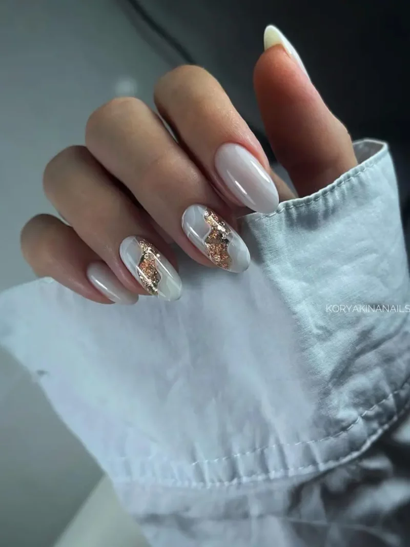 Любительницам более скромных вариантов дизайна будет достаточно украсить один палец. Эффект битого стекла сейчас заменяет всеми любимый глиттер.