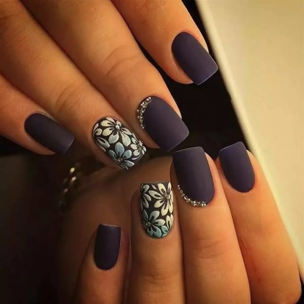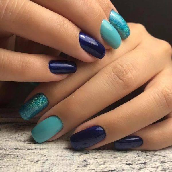 Самый глубокий цвет, комбинируется с белым тоном. Синий оригинально смотрится в маникюре с красным и чёрным. Светло-серый и синий подойдёт для будней и официальных торжеств.