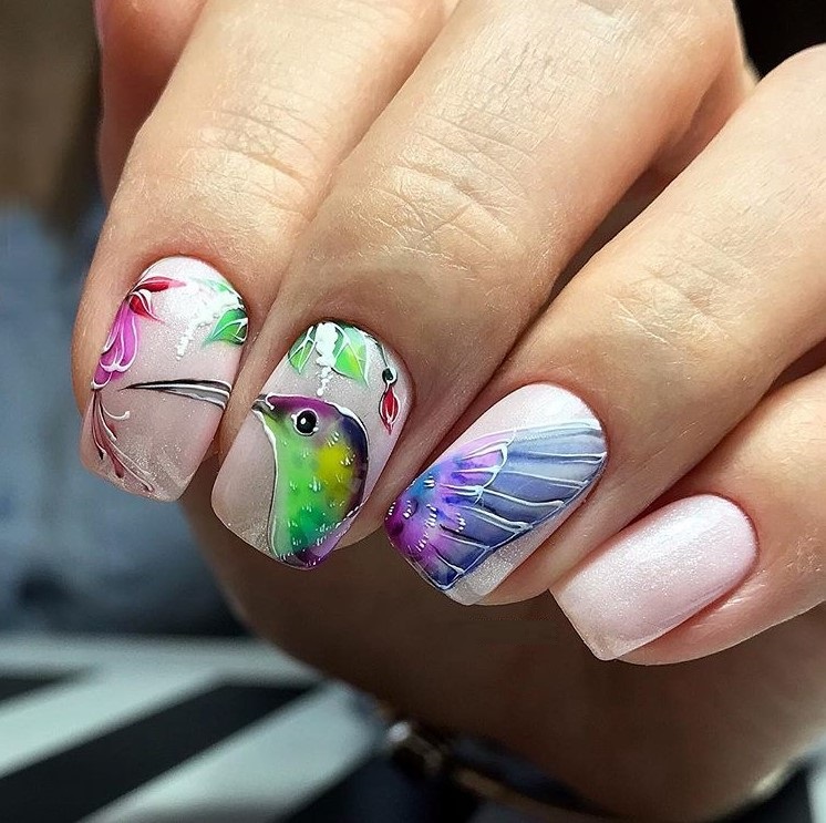 Для летнего маникюра характерны яркие сочные краски. Можно использовать любую технику nail art для создания уникального дизайна. Подойдет абстракция, цветочный принт, градиент, френч и другие стили. Используют пляжные мотивы, фруктовый микс.