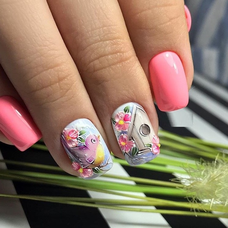 В весеннее время в тренде флористические мотивы. Выбирают нежные пастельные тона, например: сиреневый, нежно-желтый, мятно-зеленый. Неплохо будет смотреться градиент из весенней цветовой гаммы. Посмотрите некоторые идеи для вдохновения на примере фото.