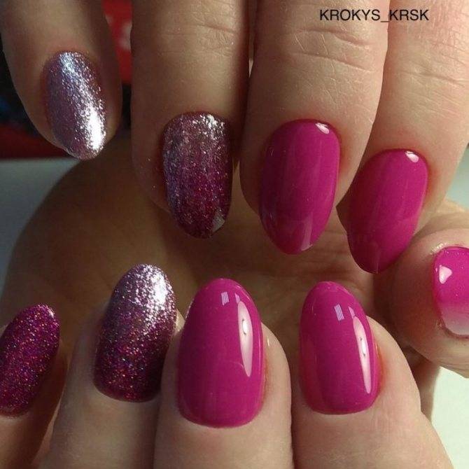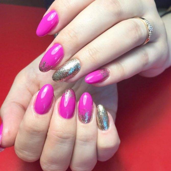Фуксия будет прекрасно сочетаться и с золотом. Золотые блестки также могут использоваться для полноценного покрытия или прорисовки отдельного элемента.