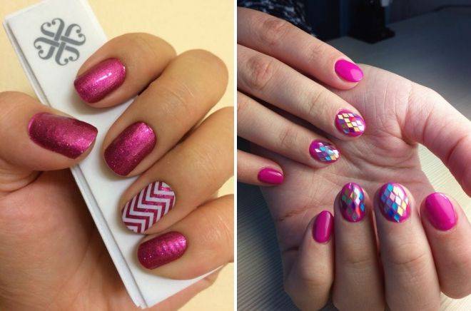 Маникюр на короткие ногти, цвет фуксия, идеально для этого подходит. Даже в однотонном исполнении он смотрится очень женственно, ярко и соблазнительно. Кроме того, для коротких коготков отлично подходит френч-вариация, легкий декор стразами, бульонками и другими объемными элементами, некрупные рисунки, размещенные на акцентных пальцах, комбинация матового и глянцевого покрытия и другие виды дизайна.