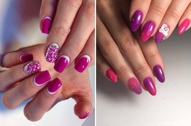 Кроме того, в 2019 году маникюр фуксия может дополняться самыми разнообразными рисунками, наклейками, декором из страз, акриловой пудрой, бархатным песком, бульонками и так далее. Невероятно популярны вариации лунного нейл-арта и френч-маникюра, для создания которых используется этот необычный и привлекательный колер.