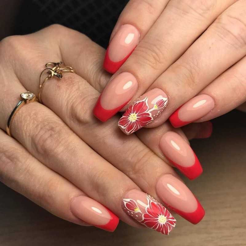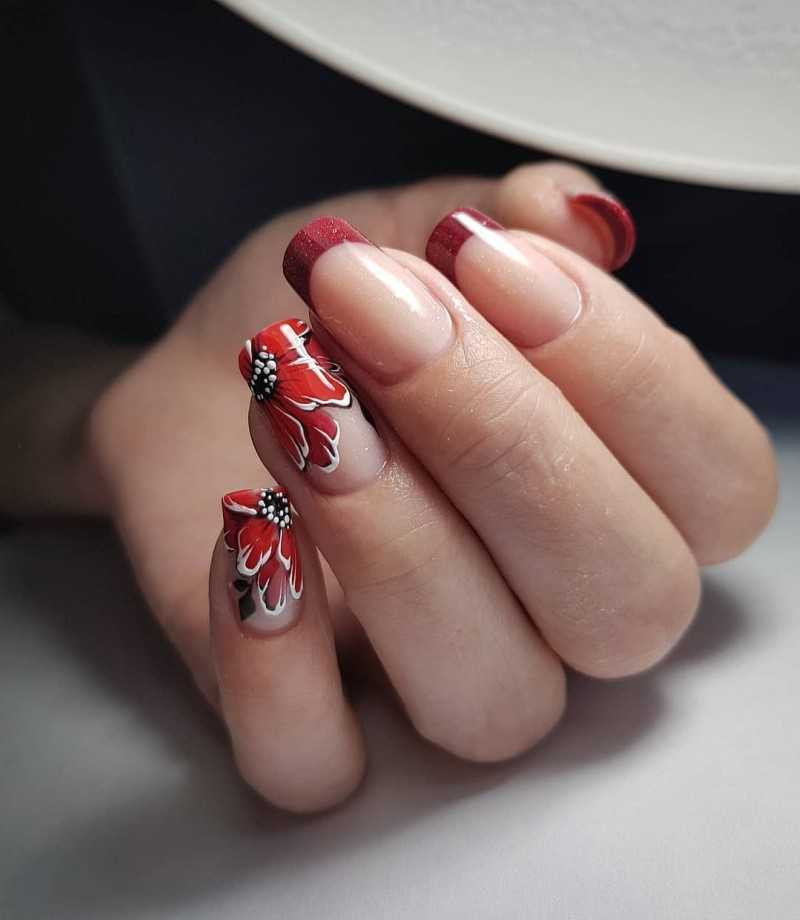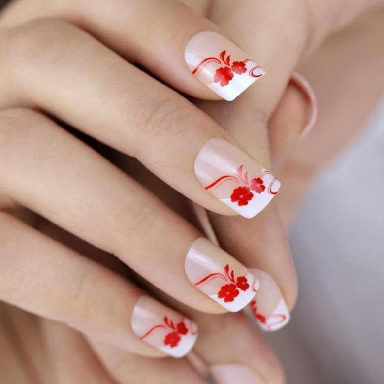 Линию френча можно выполнить классической, диагональной, или косой. При этом флористические рисунки располагаются на любой части ногтевой пластины. Очень часто рисунком украшают саму улыбочку френча или же заполняют полностью весь ноготок. В таком маникюре декор применяется по желанию