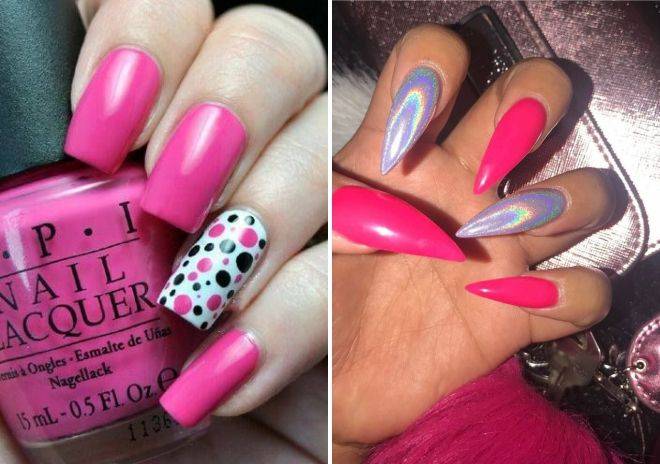 В 2019 году яркий маникюр фуксия завоевал почетное звание одного из главных трендов сезона. Он выглядит очень красиво и современно, поэтому так нравится молодым барышням и женщинам более старшего возраста. Хотя стильно смотрится и однотонная вариация такого дизайна, все же большинство девушек в новом сезоне отдадут свое предпочтение комбинированным видам нейл-арта, в которых этот ярко-розовый цвет сочетается с черным, белым, золотым и другими оттенками.