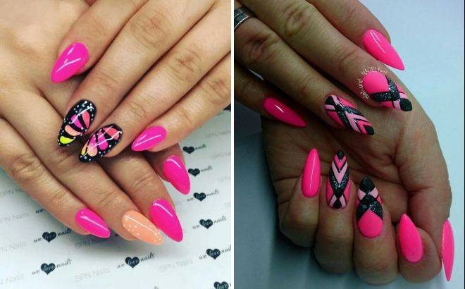 Однотонное глянцевое покрытие, так же, как и дизайн с блестками, стразами или рисунками, на чрезмерно длинных ноготках может выглядеть вульгарно. По этой причине оптимальным выбором должен стать матовый топ или же комбинация яркого колера с другими, более нейтральными оттенками. Так, в этом случае отлично подойдет маникюр 2019 фуксия с черным, а для праздника или торжественного мероприятия можно выбрать очаровательный дизайн с золотом.