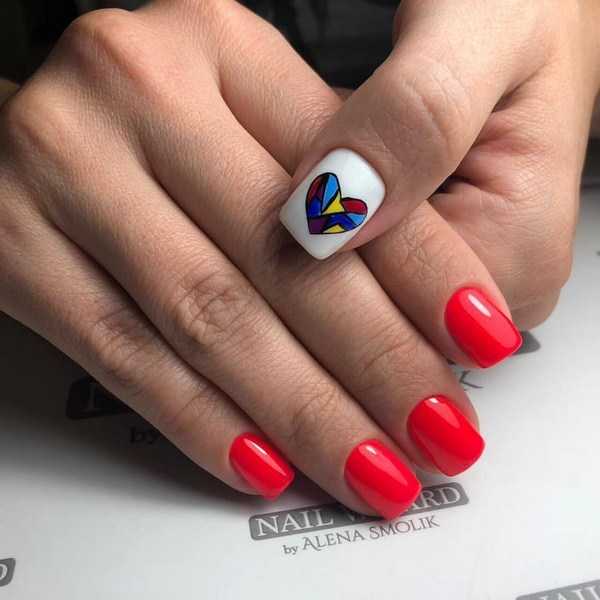 Не похожей на иные дизайны ногтей может стать модный рисунок сердца в технике «color block», с помощью которой рисунок делится на несколько секторов, покрытых разными тонами одного цвета либо разноцветными гель-лака. Преимущественно, рисунок сердца выполняется на большом пальчике в дизайне маникюра на 14 февраля.