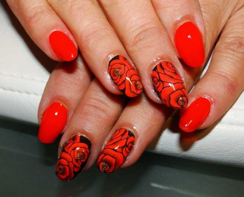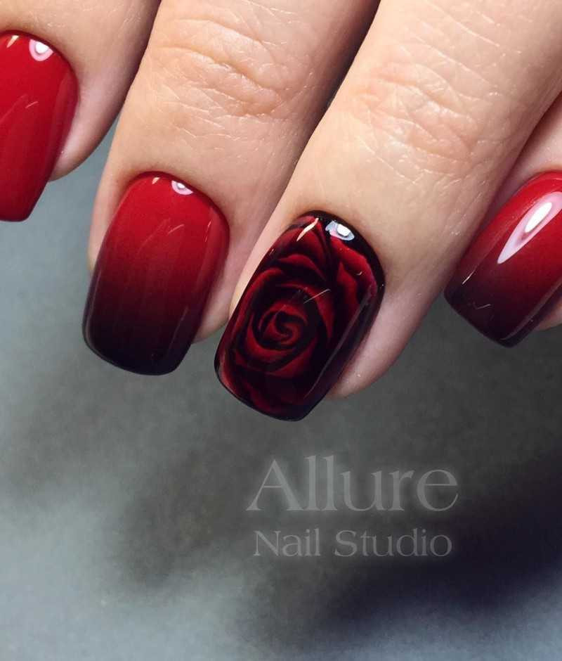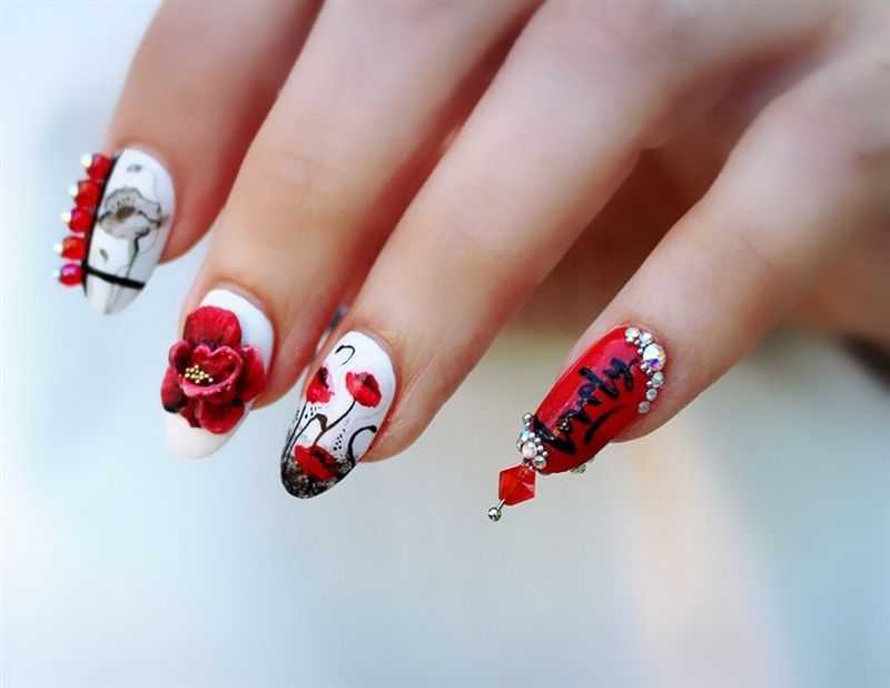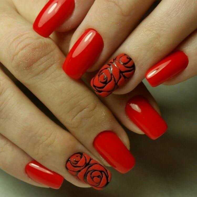 Настоящий торжественный маникюр сложно представить без красного оттенка лака. Придавая торжественность и нарядность в любой дизайн ногтей, модный красный маникюр с сердечками, словами, изображениями влюбленных парочек станет беспроигрышным вариантом модного романтичного дизайна ногтей на 14 февраля.