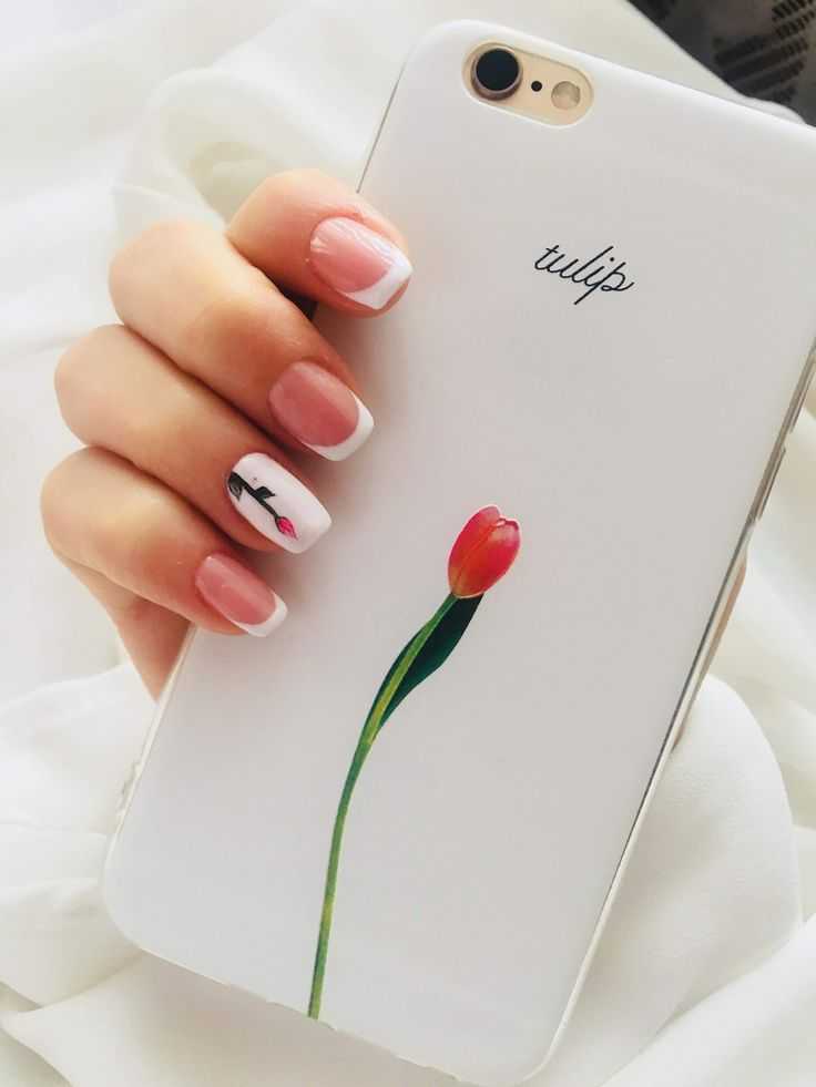 Белый дизайн маникюра отлично подойдет для тех, кто предпочитает свежий и воздушный маникюр. Можете поэкспериментировать и добавить какой-нибудь яркий акцент. Например, небольшой рисунок яркого цвета.