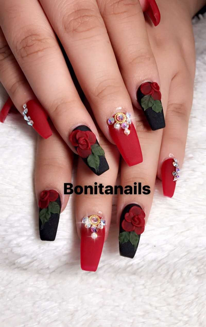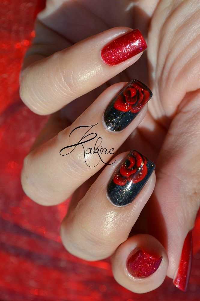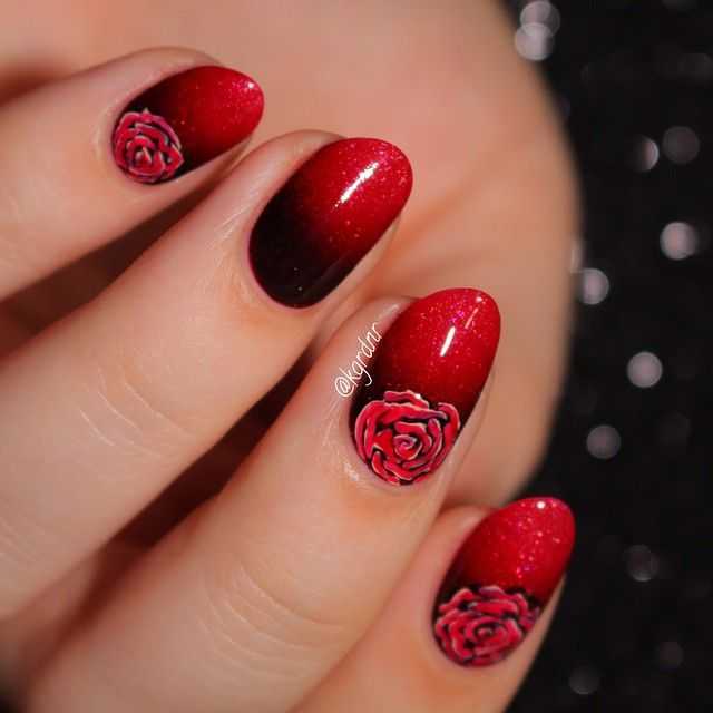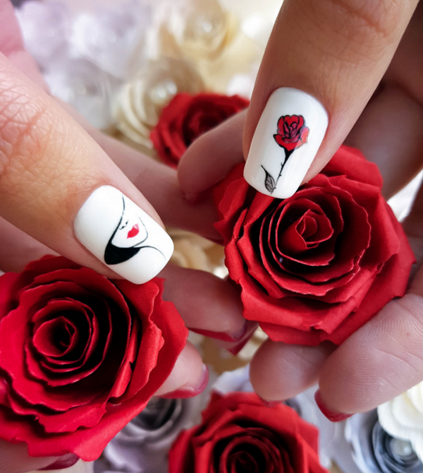 Смело и неординарно будет смотреться маникюр на День Валентина с портретами девушек, лицами и глазками, выполненными в изящном решении – с алым лаком, стразами и бульонками. Эффектность придаст и бархатный эффект ногтей в романтическом исполнении.
