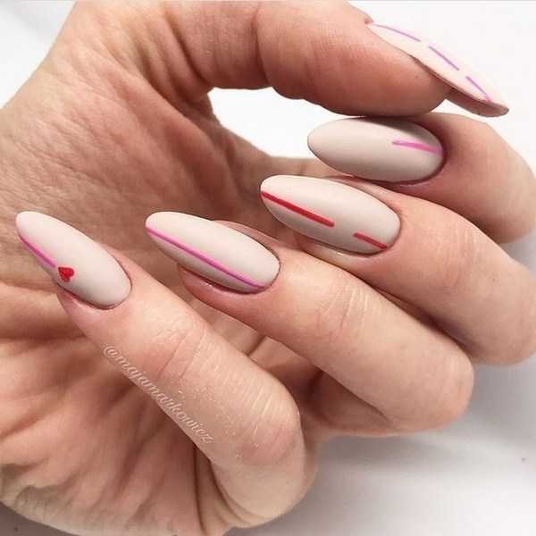 Лаконичность минималистичного маникюра с сердечками обеспечивается еще и нюдовыми оттенками с тоненькими линиями и микросердечками в красном цвете.