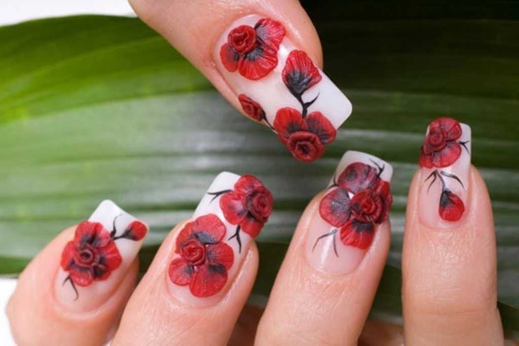 Линию френча можно выполнить классической, диагональной, или косой. При этом флористические рисунки располагаются на любой части ногтевой пластины. Очень часто рисунком украшают саму улыбочку френча или же заполняют полностью весь ноготок. В таком маникюре декор применяется по желанию
